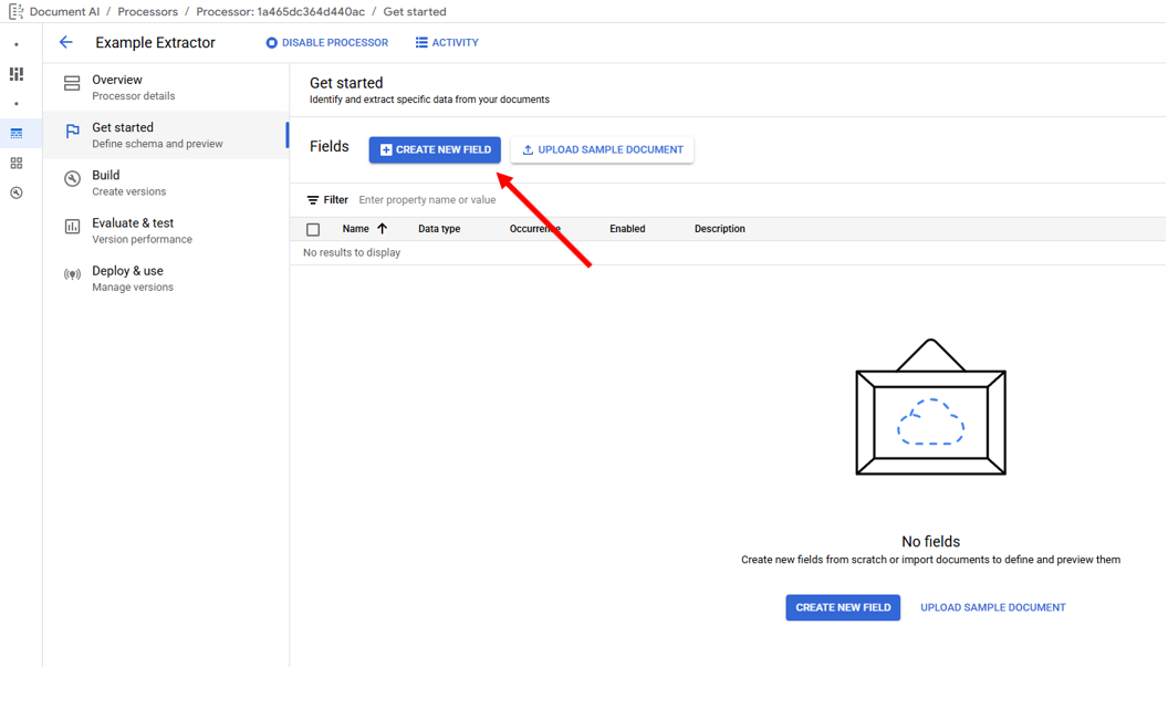 The Extractor Processor Schema is managed on the "Get started" page, and is used to Create Labels, Enable/Disable Labels, Delete Labels, and Edit Labels. When creating labels, it is best practice to choose descriptive names. Note Label Names cannot be edited after document labeling has started, and the Deleting and Editing of a Label is disabled after it is included in a trained processor model, with the exception Editing a Label's Description is always enabled.