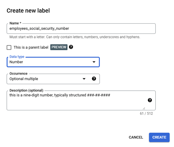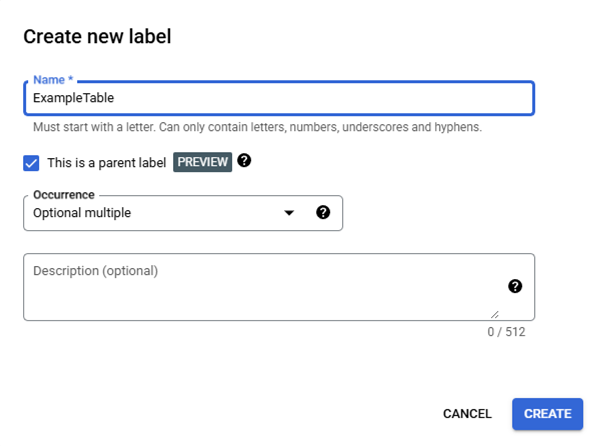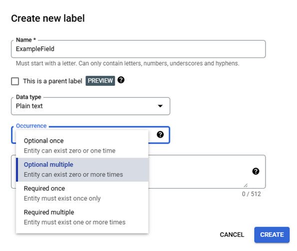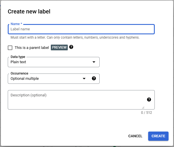To create a label, click on "Create New Field" this will open the "Create new label" popup in the middle of the page for setting the Label Name, Parent Label Attribute, Data Type, Occurrence, and an optional Description.
