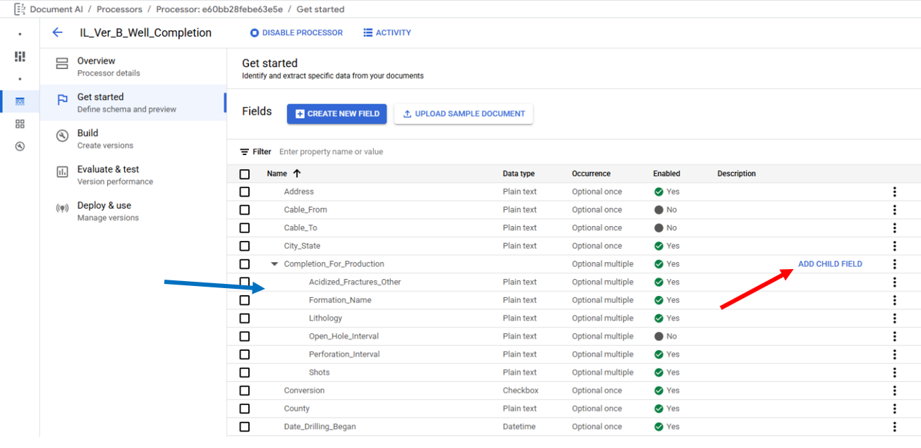 The Label Name is used by the models to form the underlying prompt, so the field names are semantically critical, it is recommended to match the name of the field on the documents for example for the document field "Signature of Permittee or Designee" the field Label Name would be "signature_of_permittee_or_designee." (https://cloud.google.com/document-ai/docs/ce-mechanisms#define_processor_fields, https://cloud.google.com/document-ai/docs/label-documents#name-fields) The Parent Label checkbox toggles between whether the new field will be normal single label or will be a parent label that is a container for single labels that need to be associate, this is ideal for extracting data from tables. Fields are added to a Parent Field from the "Get started" page by clicking on "Add Child Field" (Red Arrow) which will also open the "Create new label" popup in the middle of the page. Child Fields will appear below the Parent Field with their Label Names indented (Blue Arrow). The Google interface currently permits nesting one additional Parent Field as a Child Field, but this functionality is not currently supported in the OGRRE Tool.