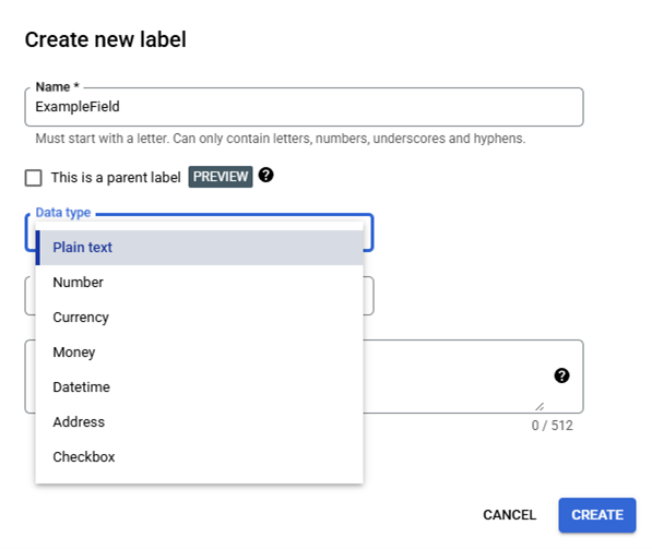 The Data Type which only applies to single labels has the options Plain Text, Number, Currency, Money, Datetime, Address, and Checkbox. The data types: Number, Currency, Money, and Datetime come with an additional feature called Normalization intended to reduce post-processing needs by cleaning the extracted text values and converting them into a standard format. https://cloud.google.com/document-ai/docs/normalization The OGRRE Workflow includes additional post-process cleaning functionality.