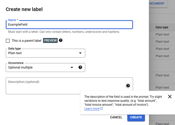 The optional Description attribute for a field is used by the models to form the underlying prompt allowing to provide additional context, insights, and prior knowledge for each entity to improve extraction accuracy and performance; Google recommends that Descriptions should include location information and text patters of the property values to help disambiguate potential sources of confusion in the document and guiding the model with rules that ensure more reliable, consistent extractions, regardless of the specific document structure or content variations. (https://cloud.google.com/document-ai/docs/ce-mechanisms#define_processor_fields) The OGRRE Team has not tested the use of the Description attribute.