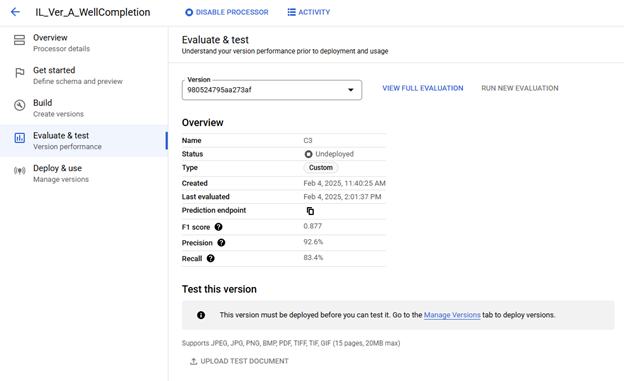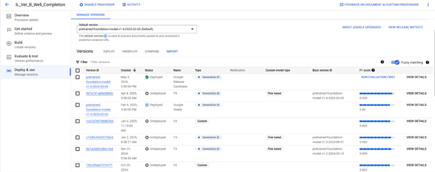 Models are managed from the Deploy & Use tab, where models can be Deployed/Undeployed, Deleted, evaluated, and a Default model can be selected. When an Extractor Processor is created a Default Model is automatically selected from Google's Stable Pretrained Foundation Models, any trained Model can be selected as the Default Model, Default Models cannot be Undeployed. For each Model the Version ID, creation timestamp, current deployment status, Model Name, and last evaluation's F1 score are displayed. Models are automatically evaluated as part of the Training Process. New evaluations can be triggered and are performed using the current active Schema and Labeled Testing Documents.