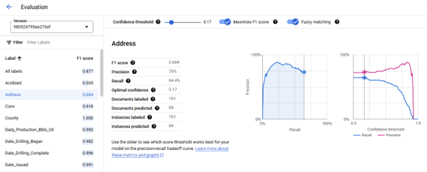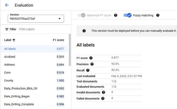 producing a model accuracy value on a scale of 0 to 1 where a value of 1 indicates perfect model prediction for the Testing Documents. (https://cloud.google.com/document-ai/docs/evaluate#all-labels)