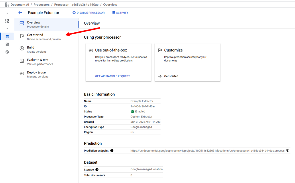 In a new Extractor Processor, the first action will typically be to click "Get started" to be brought to the Schema definition page.