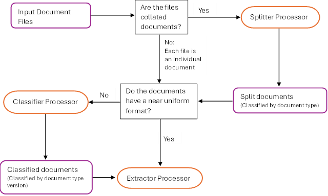 If the Input Document Files are collated (multiple documents within each file), a Splitter Processor is used to identify the boundaries between documents and when the collated document files also contain multiple document types the Splitter Processor is used to simultaneously classify the split documents by document type.
