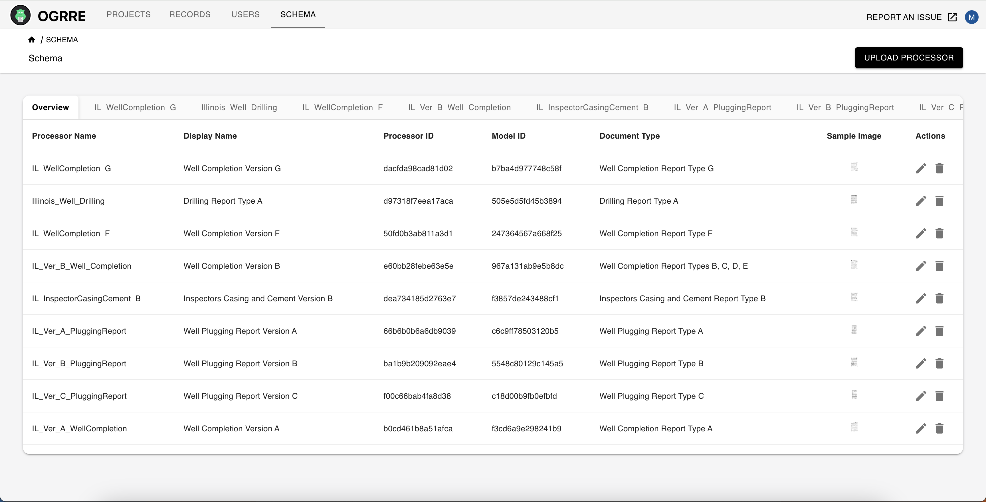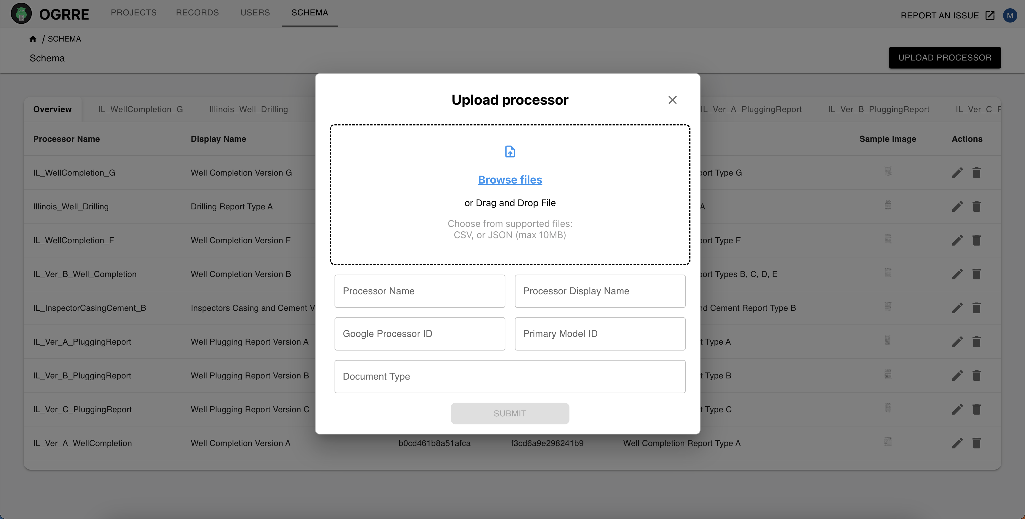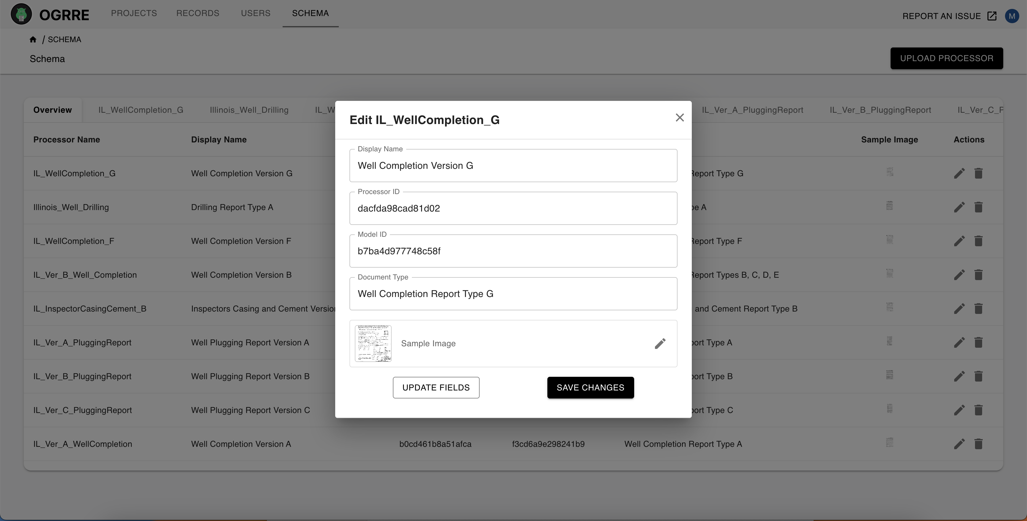 Processor schemas define which fields are displayed and edited in OGRRE records. You can use the OGRRE UI to view schemas, upload new processor schemas, and edit existing processors.